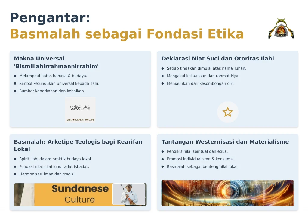 Pembedahan teologis dan epistemologis terhadap kalimat Bismillahirrahmanirrahim yang dikorelasikan secara spesifik dengan tiga dimensi etika manusia dalam budaya Sunda: