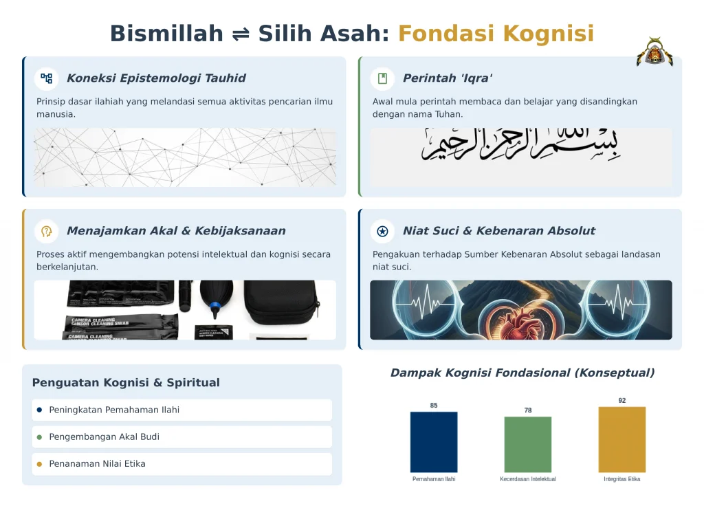 Koneksi Epistemologi: Bismillah dipandang sebagai fondasi kognisi yang disucikan. Ini merujuk pada perintah ‘Iqra’ (membaca/belajar) yang harus disandingkan dengan nama Tuhan.